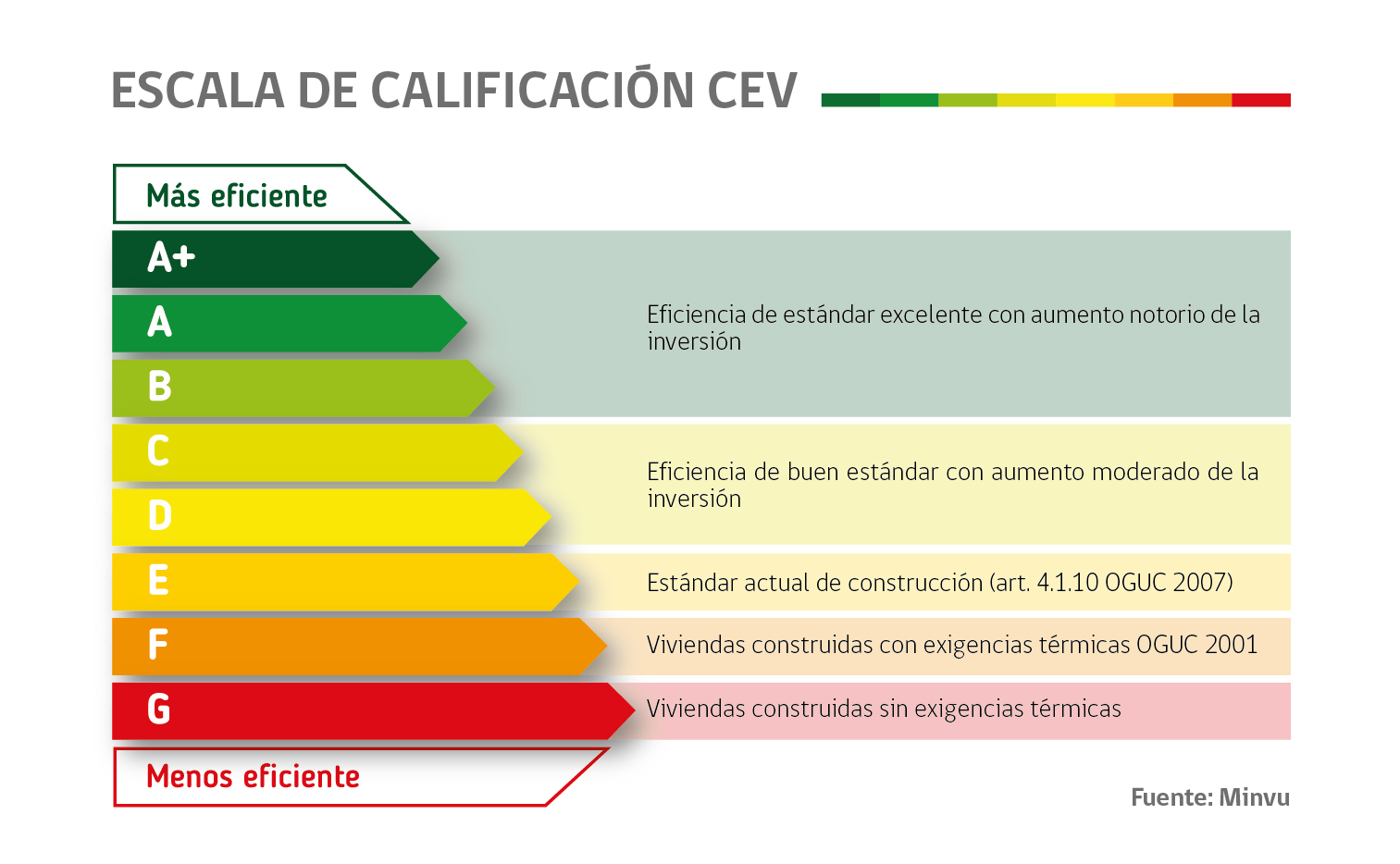 La Calificación Energética de Viviendas (CEV) consiste en un sistema similar al que se usa para clasificar energéticamente refrigeradores o lavadoras. Es decir, a través de una evaluación, las residencias tendrán etiquetas de colores y letras distribuidas en siete categorías que van desde la A, la más eficiente, hasta la menos eficiente clasificada con la letra G en color rojo. La medición considera requerimientos de calefacción, iluminación y agua caliente sanitaria.