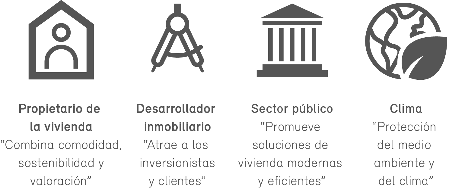 Los siguientes cuatro grupos se benefician de Minergie: el propietario de vivienda, el desarrollador inmobiliario, el sector público y el clima.